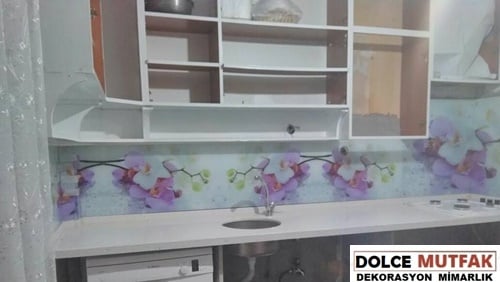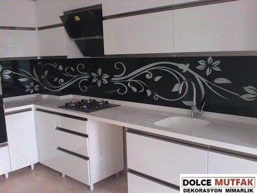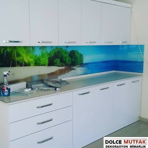 Bu uygulamada Tezgah Arası Cam camın arka kısmına renk veya desen yapıştırılıyor; ön yüzeyde cam dokusu kalıyor. İstediğiniz bir renk seçerek, düz bir tasarım da tercih edebilirsiniz. Sınırsız sayıda baskı arasından, zevkinize uygun bir model de seçebilirsiniz.. DOLCE MUTFAK Sitesinde yayınlanmış mutfaklar arasında boğaz manzarasından, çiçek desenlere, denizden doğa manzarasına çok çeşitli baskılarda tezgah arası cam kullanılmış mutfak var. Burada fotoğraflar arasında gezerken, ister baskı, ister düz renk, kendi mutfağınızın renk ve stiline benzer mutfaklardan fikirler bulmaya çalışın.